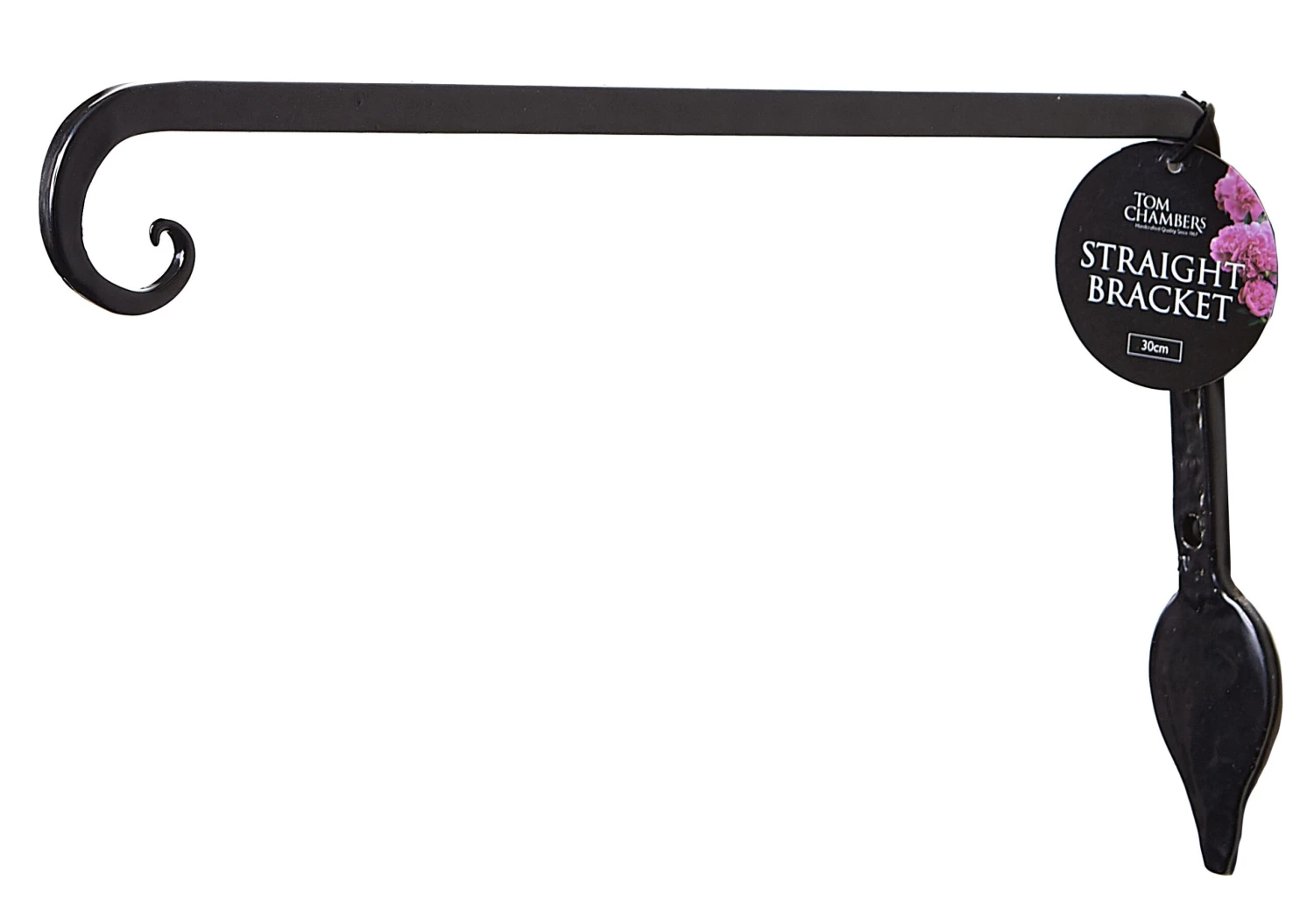 This versatile heavy duty 30cm straight bracket. Handforged metal blacksmith styling with leaf design. Ideal for a variety of uses for hanging bird feeders and many other garden objects. Finished in matt black.