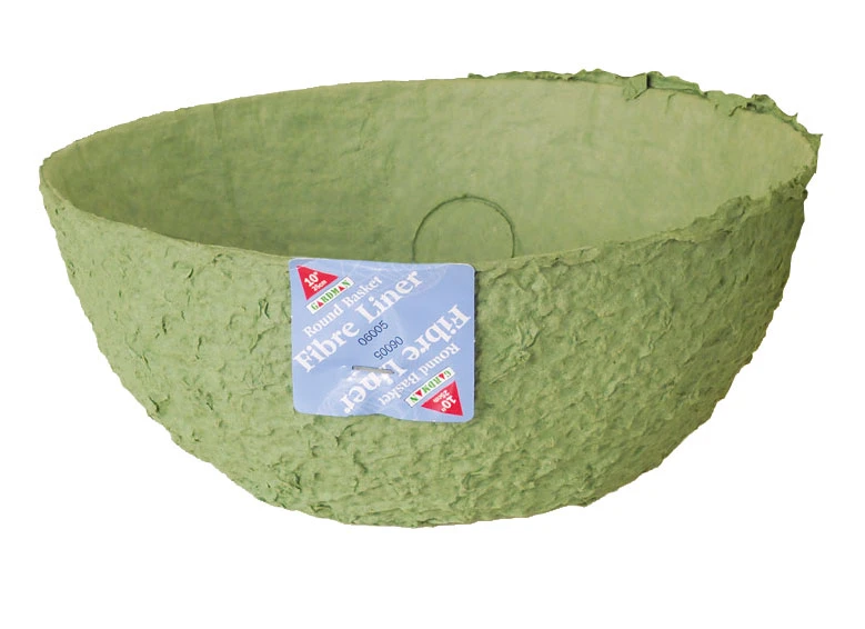 This hanging basket flower liner is made from recycled compressed paper pulp.