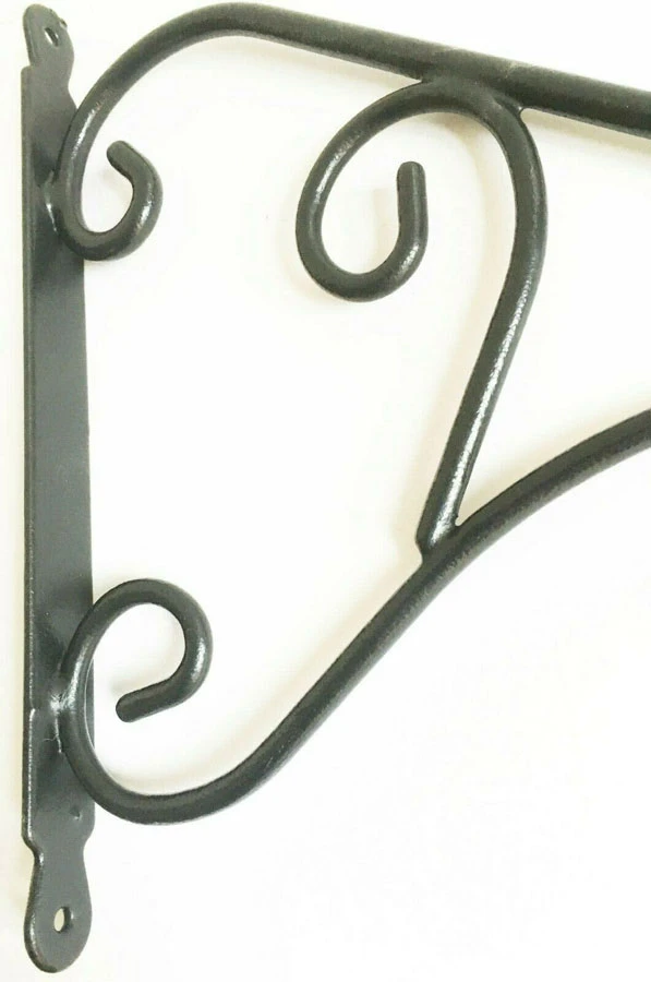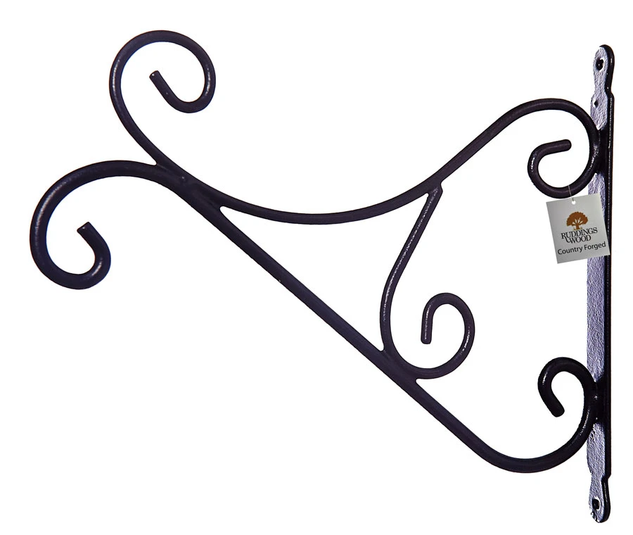35cm Country Forged Scrolled Black Metal Hanging Basket Bracket is ideal for hanging baskets, bird feeders and topiary. This heavy-duty basket is made from round solid 8mm steel with durable black powder weatherproof coating. Ideal for hanging baskets, garden topiary and wild bird feeders. Pre-drilled hole for easy fitting.