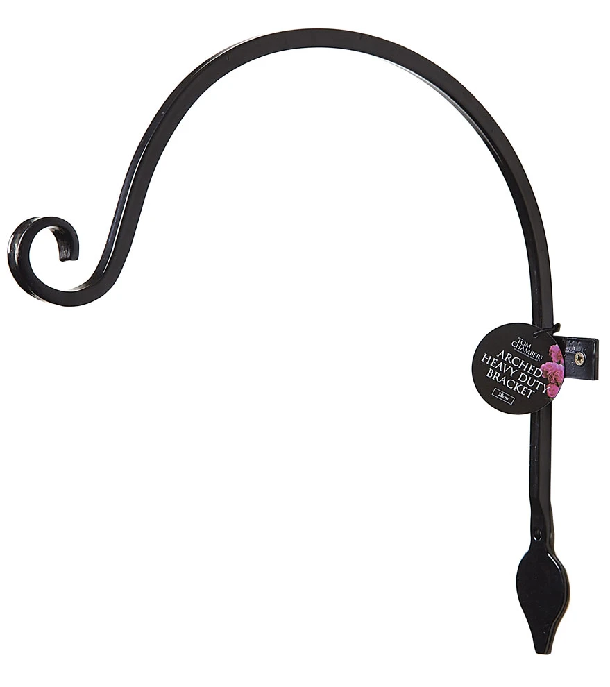 This traditional heavy duty 38cm arched bracket hook. Hand forged metal blacksmith styling with leaf design back plate. Ideal for a variety of uses for hanging bird feeders and many other garden objects. Finished in matt black.