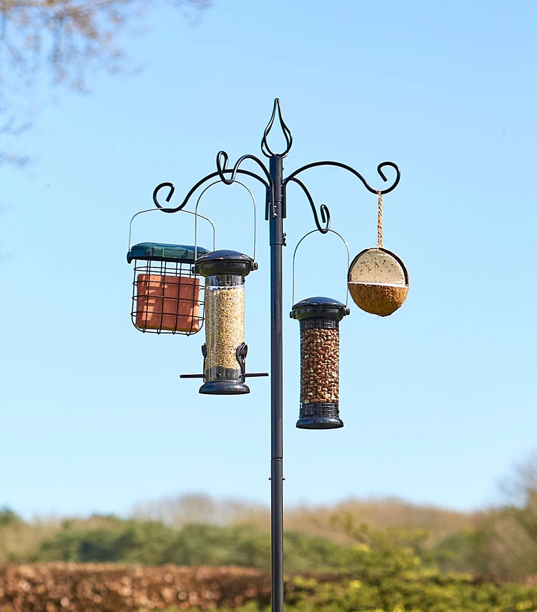 This wild bird dining station is made from metal and finished in a black finish, providing tasty food and fresh water to wild birds. Featuring a four-way bracket that can accommodate a variety of bird seed and nut feeders, this feeding station is perfect for any size garden.