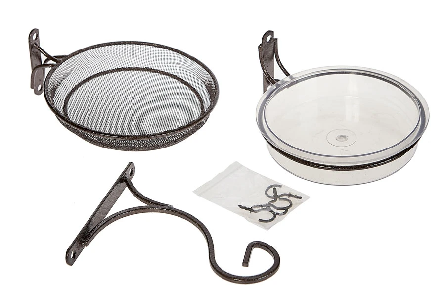 This Bird Table accessory set is design to be attached to wooden bird table stand, adding extra feeding and watering for the garden birds. This set includes a seed metal mesh tray, water dish and ring bracket, smaller metal bracket and four small hooks for hanging small feeders or fat balls in nets.