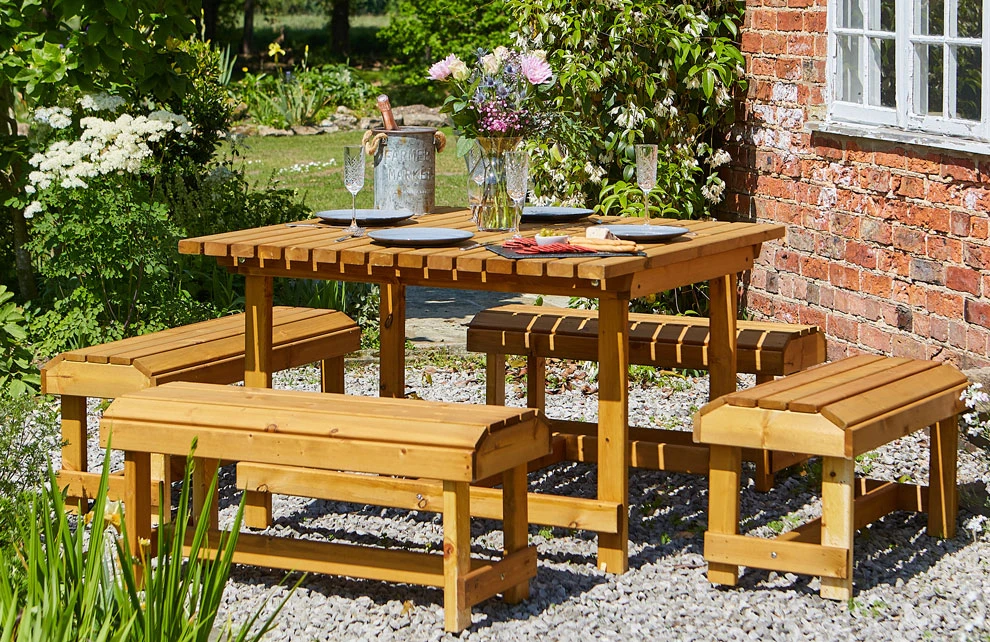 This Coxwold Patio Table and Bench Set is handcrafted in Great Britian by Tom Chambers. Square design patio table, it has a parasol hole and a cross brace to strengthen the table. Four large benches have curved tops for comfort and support. The set is compact yet spacious enough to seat up to eight people. Finished with a tan wood stain to protect from the elements.