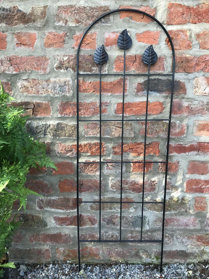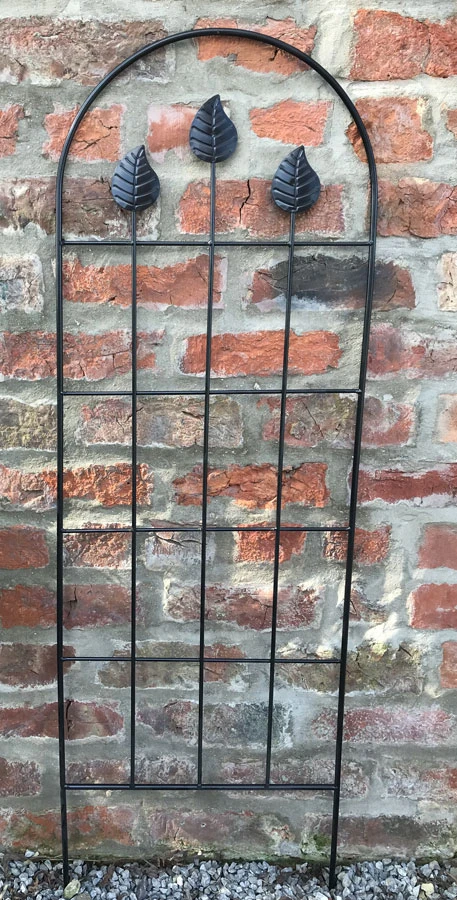 This curved top leaf trellis framework can be used for climbing plants and help to define and partition dividing different parts of the garden. Perfect for creating a screen adding plant life and interest to garden wall or garden fences. Features curved top ironwork with leaves detailing ideal square lattice ironwork support for creeping climbing plants stems to hold onto. These trellises are crafted in coated metal ironwork with a matt black powder coating for weather protection, robust and strong tellies perfect for providing a framework for climbing plants adding structure to garden design.