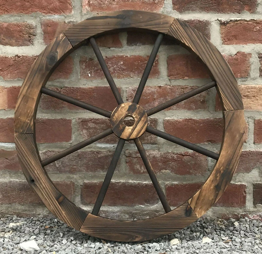 This decorative wood cartwheel can be a perfect addition to garden walls or fences. Manufactured and supplied Pre assembled from solid wood with a rustic vintage burnt wood timber finish which offers weather protection. Traditional wooden 8 spoked design with centre hole, decorative accessory ideal for any size of garden and patio areas.