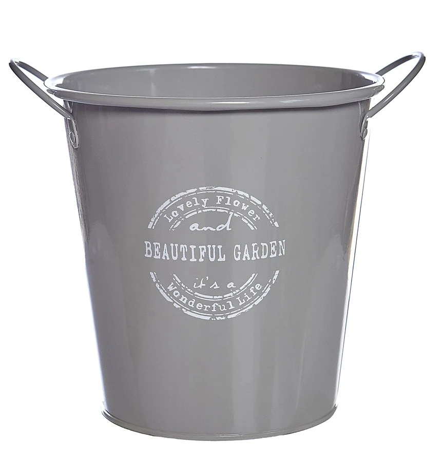 Metal French Grey tin bucket flower planter containers with wood handles ideal for flowers or plants. This vintage style round bucket is manufactured from metal with black powder coating. Vintage and stylish look with a logo design front, ideal for use as a centrepiece on wedding tables and for herbs or bulbs on windowsill or outdoor on the patio area.