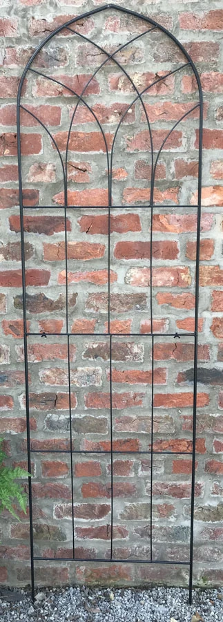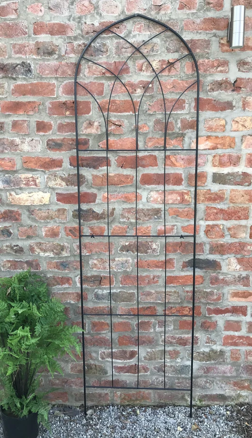 These garden trellises main features are both the height and width, measuring an impressive 210cm high and 60cm in width suitable for maximum coverage for wall, fences and for privacy trellis. Ideal for clematis, climbing rose and honeysuckle. Decorative trellis with gothic arch top with metal ironwork detailing. Manufactured from metal with black powder finish for weather protection. Due to the height , comes in two frame sections, easy it fit, sections interlock together and held with 2 wing nuts (nuts & bolts included) to form a sturdy trellis.