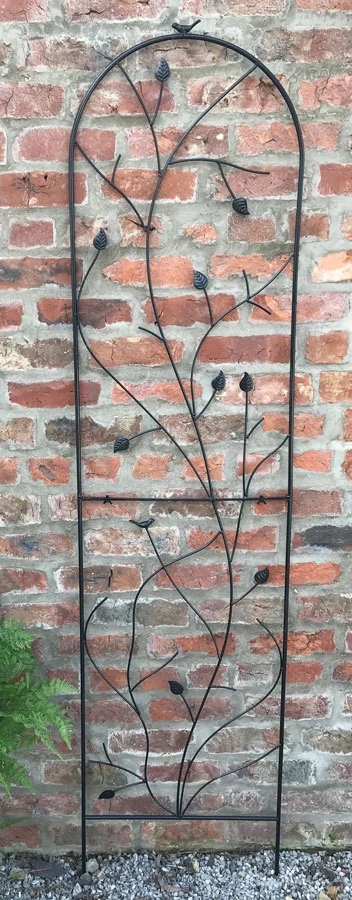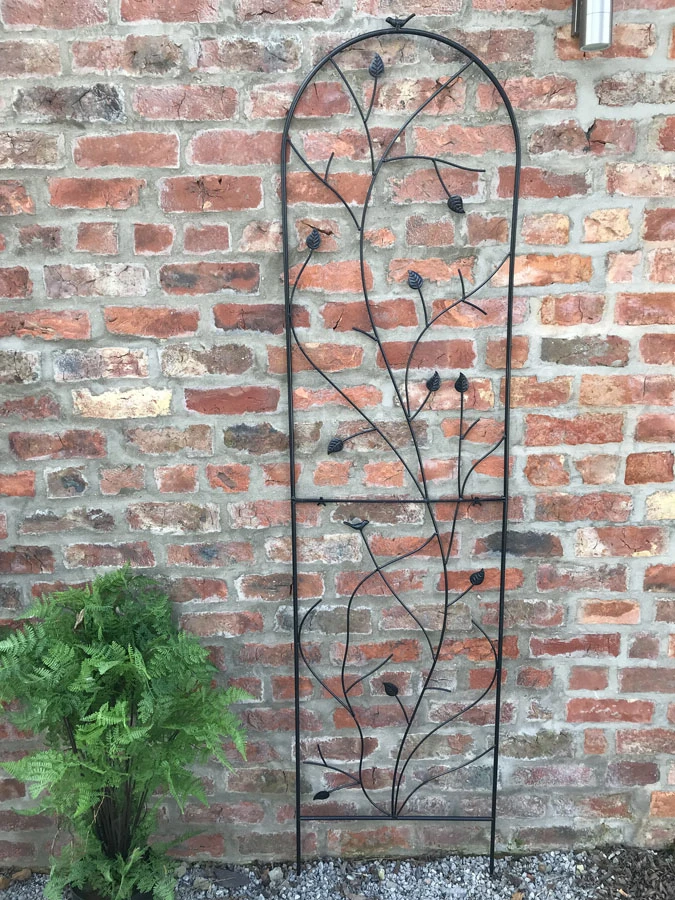 This extra tall 200cm and extra wide 50 cm garden black wall plant trellis is a quick and instant way to create height for flower plants to bloom adding structure and interest to garden wall, fences or as a patio wall feature with the detail ironwork of leaves, birds this obelisk will be an attractive addition even during the weather months. Constructed from steel as a two-frame section support and coated with a matt black, which offers a contemporary looking finish and offers protect against corrosion and weathering.