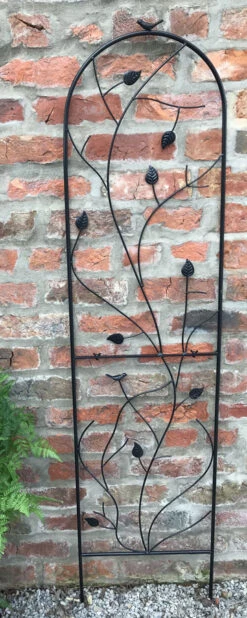 This garden wall trellis is a quick and instant way to create height for flower plants to bloom adding structure and interest to garden wall, fences or as a patio wall feature with the detail ironwork of leaves, birds this obelisk will be an attractive addition even during the weather months. Constructed from steel as a two-frame section support and coated with a matt black, which offers a contemporary looking finish and offers protect against corrosion and weathering.