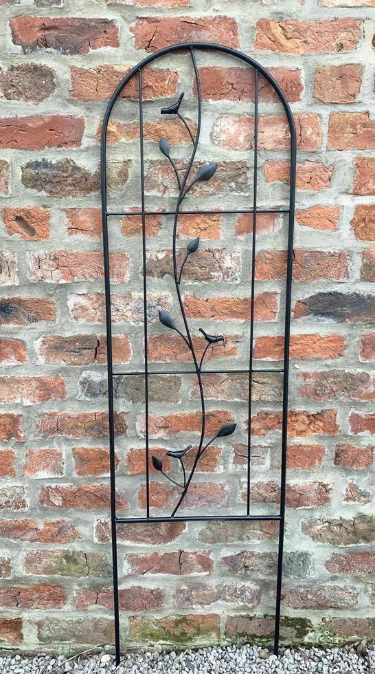 This Gigha Garden Trellis is constructed from high-quality metal. For weather protection, this garden trellis is finished with a black powder coating, making it a must-have addition to any garden space. This plant support for climbing clematis plants has a beautiful design and pattern, this piece adds a touch of elegance to any outdoor area. An attractive way to allow your climbing plants to flourish, a lovely decorated ironwork featuring leaves and bird designs.