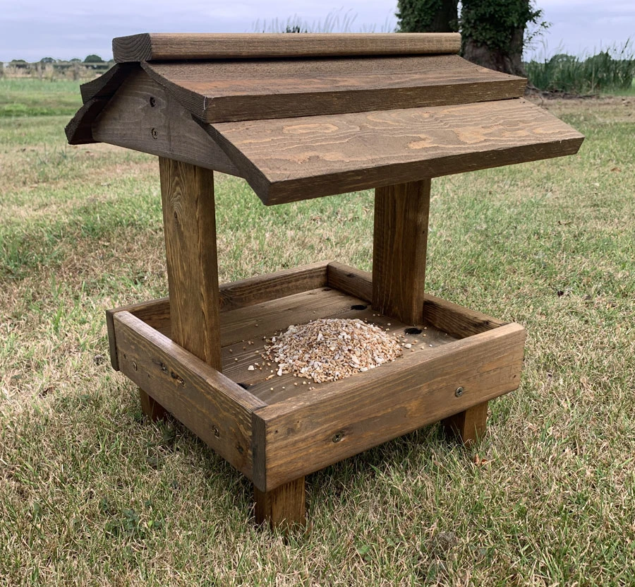 These wooden roofed ground feeding bird table is suitable for ground feeding garden birds like robins and blackbirds. This ground bird feeder with roof with four drainage holes on feeding platform helps to Keep bird food dry and fresher. Manufactured from quality smooth redwood timber coated with brown wood-stain which offers safeguarding against climate weather conditions.