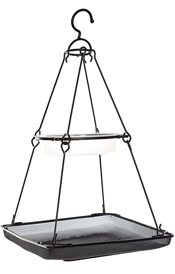 This all in one water or bathing and feeding bird station features large fine metal mesh feeding tray allows good drainage keeping bird food fresh and dry. Manufactured from metal with black powder coating for weather protection. Durable round water dish, ideal for bathing and watering. Suitable for feeding many different types of bird seeds and foods.