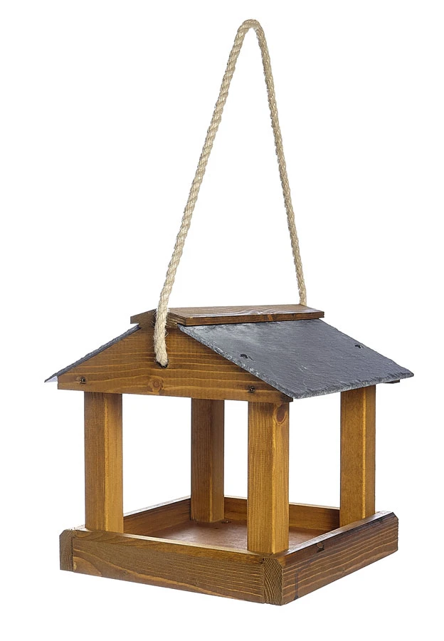 Manufactured from timber with tan wood stain for weather protection. Features real slate roof with thick hanging rope. Perfect for hanging from trees or brackets for feeding wild bird seed mixtures. Features raised feeding tray edges to prevent wind from blowing bird feed away and stopping birds from scattering food to the ground. Drain holes for drainage of excess moisture and rain to help keep seed fresh and dry. Manufactured in Great Britain.