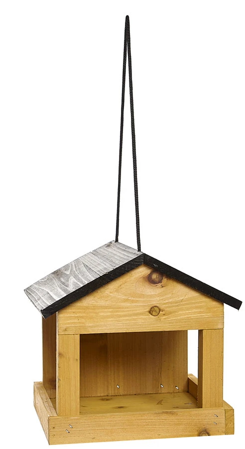 Attractive readymade wooden hanging wild bird table with roof is ideal for the feeding garden wild birds. Ideal for most types of seed mixtures for a wide variety of wild birds.