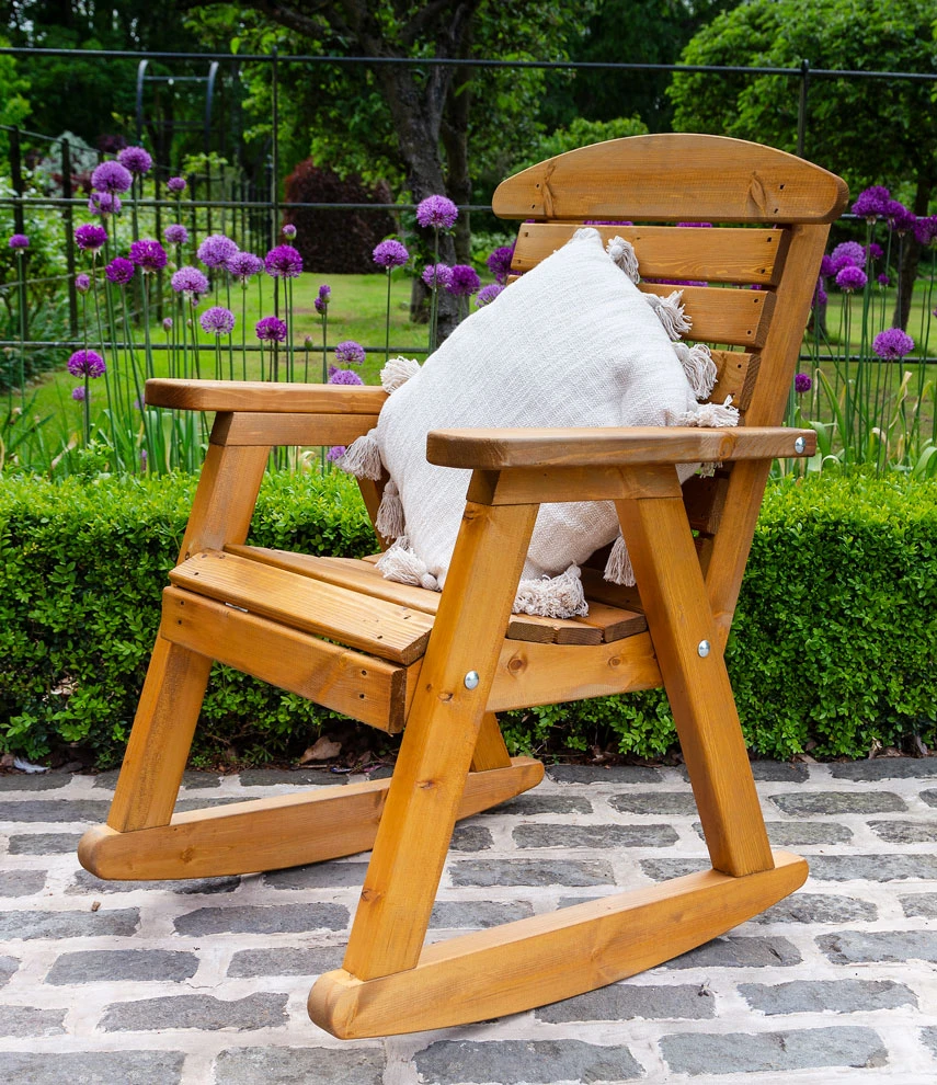This Hetton Rocking Chair are designed for complete comfort with a curved seat and front section for a better seating position and rounded rockers. A wonderfully relaxing rocking chair. Manufactured and handcrafted in Great Britain from heavy duty timber, finished with a warm tan wood stain for weather protection.