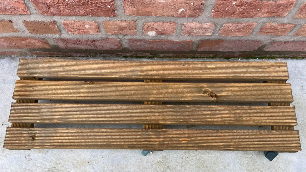 This large plant container trolley is the perfect solution for moving heavy wide plant containers around, with a grooved wooden stand surface ensures that the pots do not slip as they are wheeled, providing a secure grip while in transit.