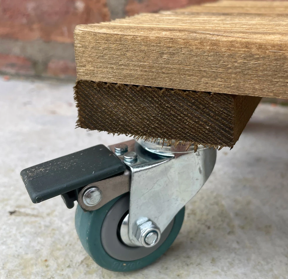 Six heavy-duty swivels 360-degree casters. Four of the casters are braked to firmly secured the plant trolley to the desired location. Made from heavy duty quality grooved wood with a thickness of 20mm. For weather protection, this timber has been stained with a brown tan colour, suitable for indoors as well as outdoors. Designed and made in the Great Britain.