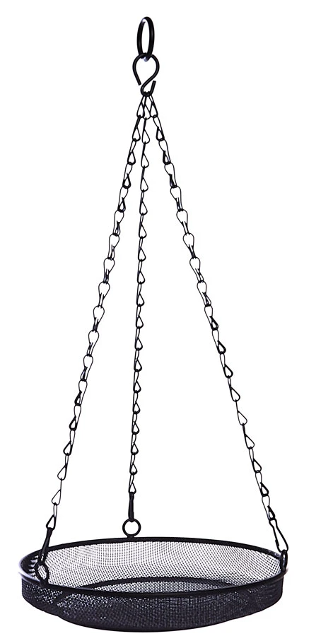 Hanging black wild garden bird micro mesh tray with chains which allows water and moisture drain helping to keep food fresh and dry. Manufactured from metal fine micro mesh which maximises airflow to keep wild bird food fresh and dry for longer.