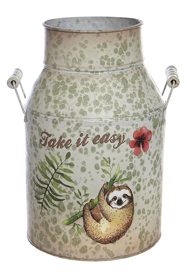 This metal tin Sloth vintage style milk churn is ideal to display flowers or potted plants for indoor and outdoor use. Manufactured from galvanised steel coating. Classic vintage stylish churn with handles and design logo. Ideal for table centre piece.