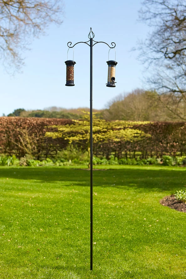 This wild bird feeding station that will suit any garden size complete with double brackets, ideal for hanging two bird feeders and a feature finial is the perfect addition to any garden. An all-in-one dining station that provides wild birds with tasty food and fresh water in a black finish.