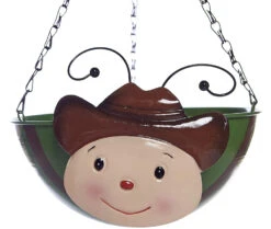 This novelty cowboy metal hanging basket will add a bit of fun for you and the children in your garden and patio area with this colourful wobble head metal handing basket. Metal hanging basket comes compete with hanging chains and hook. Made for quality steel with hand painted finish for maximum impact. Drainage hole in bottom of basket. The cowboy head is attached by a metal spring making it wobble with any slight movement of the basket. Hold 5 litres of compost (approx.)