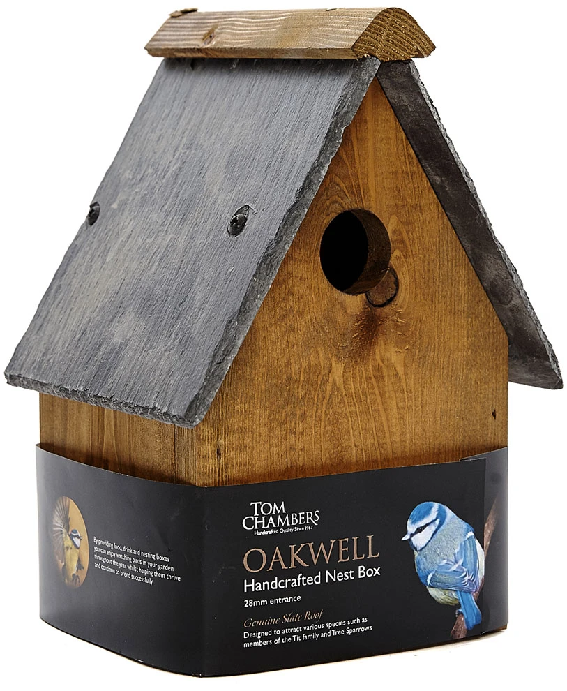 This Tom Chambers nesting bird house box is handcrafted readymade from quality durable timber with a dark wood stain offering protection against weathering. Genuine rustic slate roof. These Oakwell wild bird nesting boxes have an entrance hole size of 28mm diameter. The rear of the bird box has hanging slots for easy fitting.