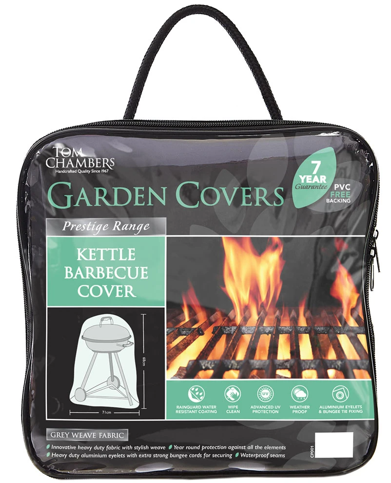 This Tom Chambers heavy duty prestige kettle barbecue stylish fabric cover has a grey weave finish. This barbecue garden cover will over all year round protection against all the weather elements. This BBQ cover has waterproof seams with Heavy Duty aluminium eyelets with extra strong bungee cords for safe securing.
