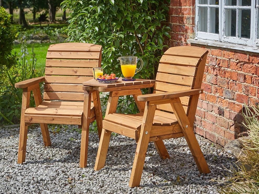 This handcrafted wooden garden companion Seats is from the Richmond Range from Tom Chambers. The beautiful Companion Seats will add a beautiful touch to any garden setting. It has a central, triangular tray that can be detached for versatility. A shaped and rounded top and rounded wood ggen back panel will make it extremely comfortable. For weather protection, the wood is stained with a tan wood stain.