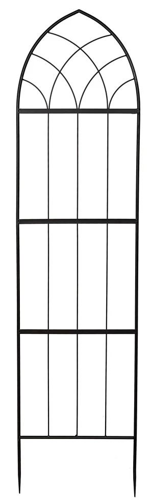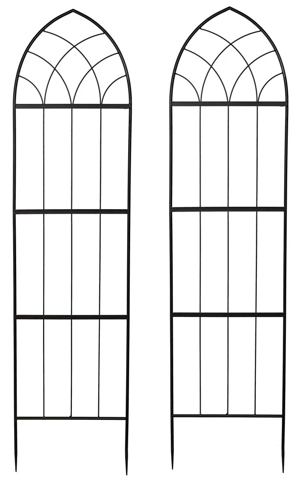 These gothic styled black metal trellises panels when used with climbing plants can create private havens or a beautiful backdrop. Manufactured from heavy-duty metal with a durable matt black powder finish to prevent steel corrosion. Spiked feet, ideal for secure fitting into ground and when used in large planters and containers. Comes in two frame sections, easy it fit, sections interlock together and held with 2 wing nuts (nuts & bolts included) to form a sturdy trellis.