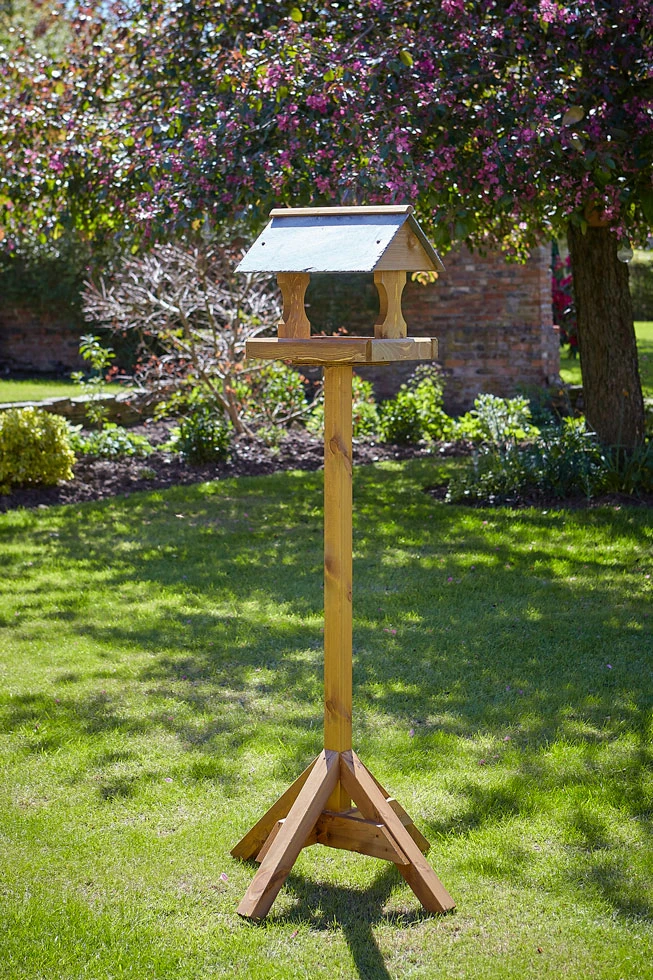Handcrafted British made Bishopdale wooden bird table features genuine slate roof, shaped and curved uprights. Ideal for any size of garden. Finished with warm tan wood stain preservative.