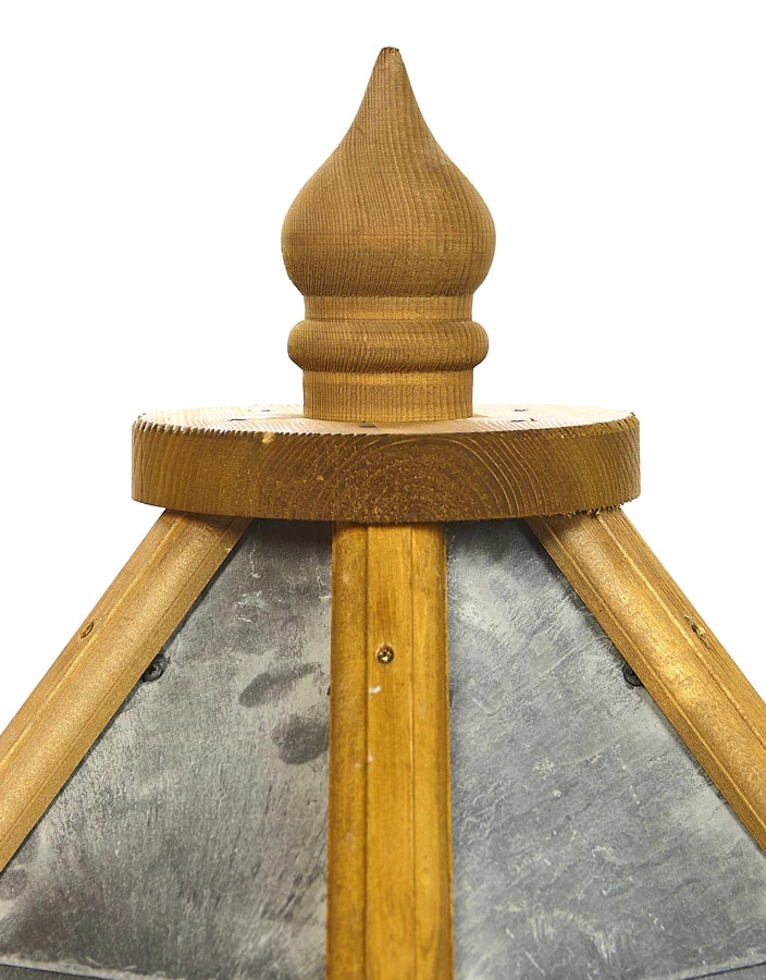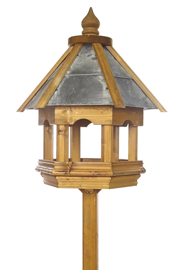 Extra large handcrafted British made Wharfedale wooden bird table features genuine slate roof, shaped and curved uprights. Ideal for the larger garden. Finished with warm tan wood stain preservative. A stunning feature with heavy duty finial.