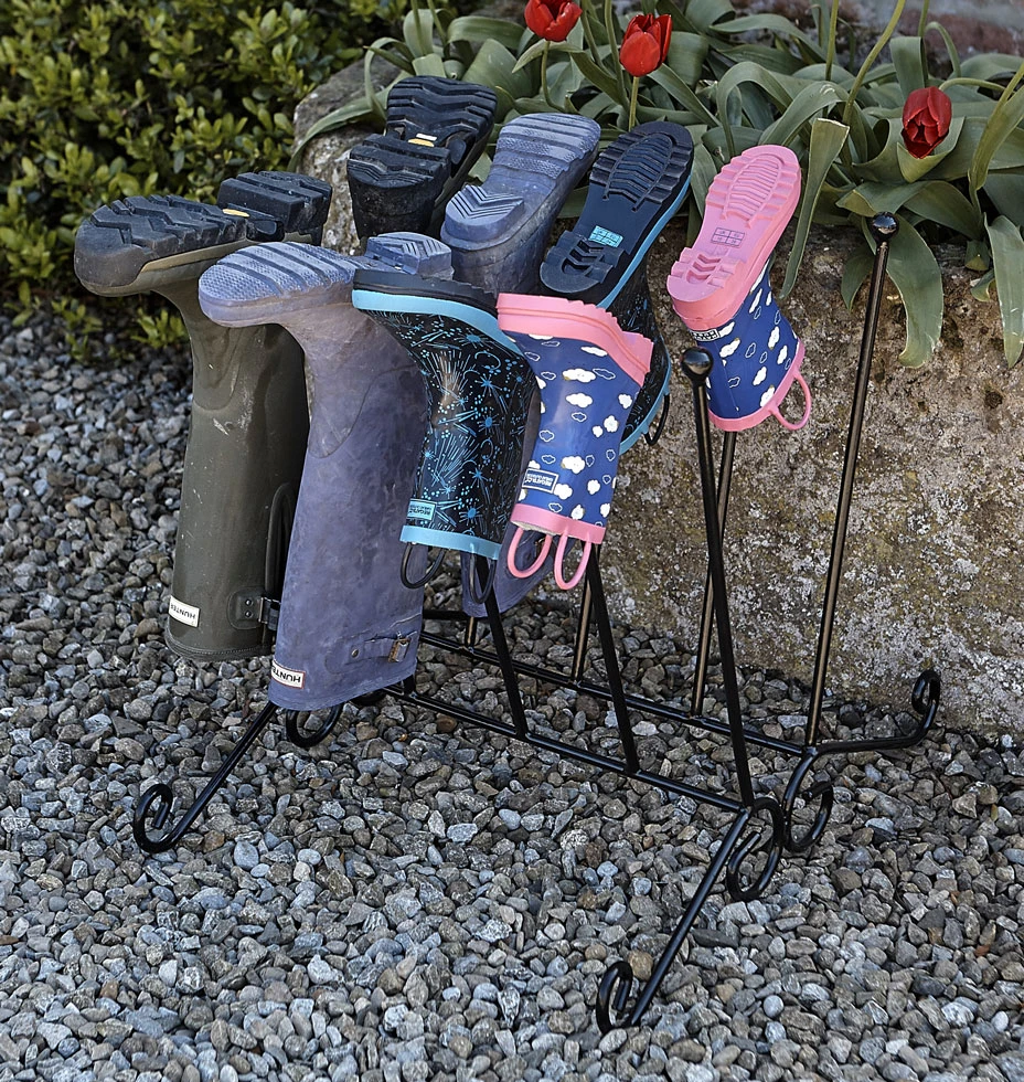 Doulbe wellington boot stand made from solid rod with PVC coating for long-life. Can be used indoor or outdoors. Made from solid one peice construction. Great way to store wellies. Holds 5 pairs of wellingtons.