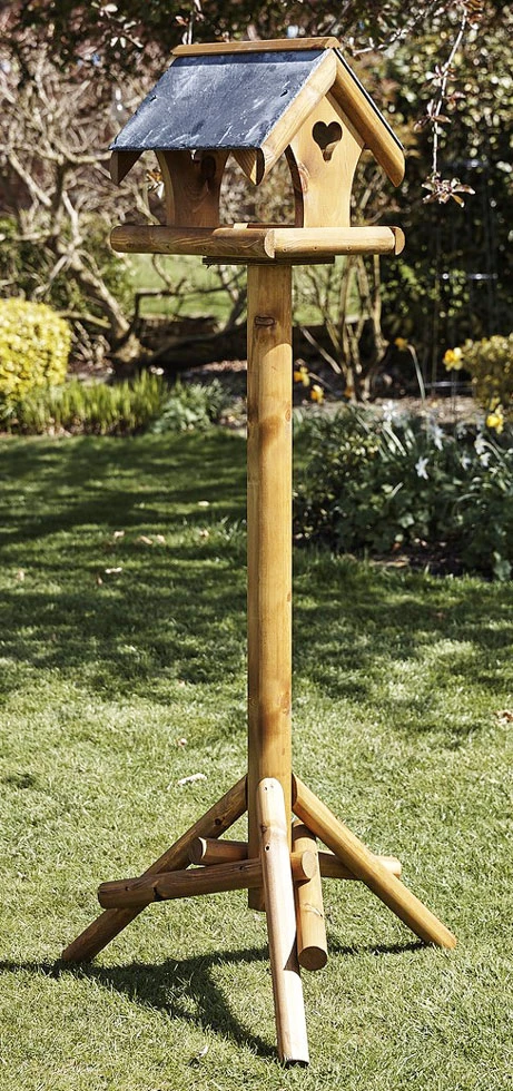 Handcrafted British made Bronte wooden bird table features pretty heart detail, genuine slate roof and heavy-duty wooden round timber to give that cottage garden look. Beautiful feature for any size of garden. Finished with warm tan wood stain preservative.