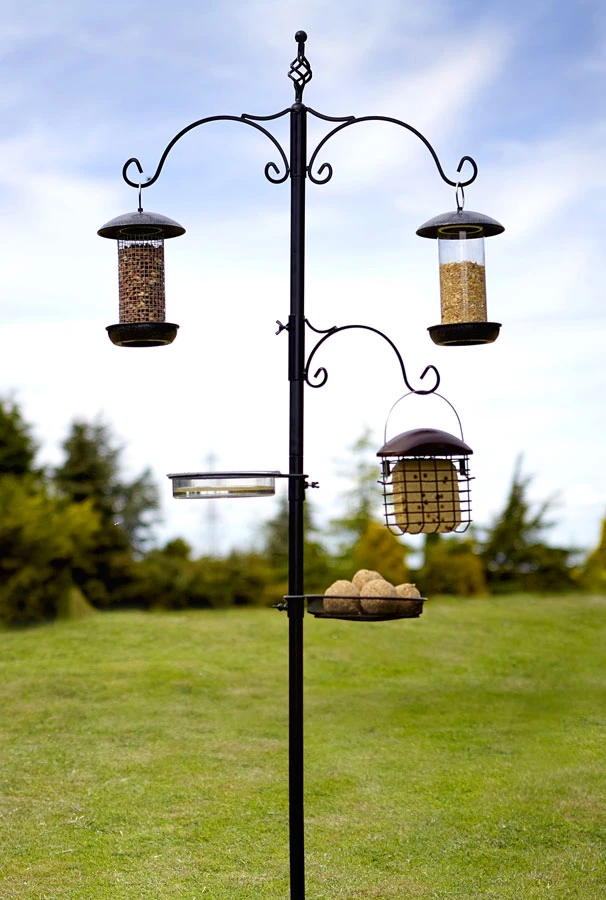 This all in one Classic wild bird station is from Tom Chambers is an ideal feeding station for wild garden bird to feed, water and bath in one area. The features of this wild bird feeding station are 220cm high feeding pole with double bracket with spiral finial, seed mesh tray, watering and bathing dish and smaller side bracket. Please note 3 feeders in the image are not included in sale.