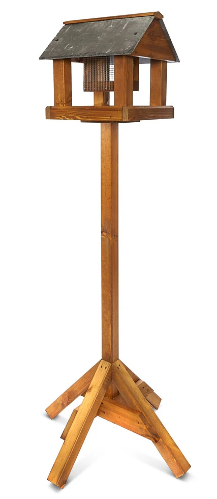 Handcrafted British made Farndale wooden bird table features integrated peanut feeder, genuine slate roof and heavy-duty wooden base for stability . Lovely feature for any size of garden. Finished with warm tan wood stain preservative.