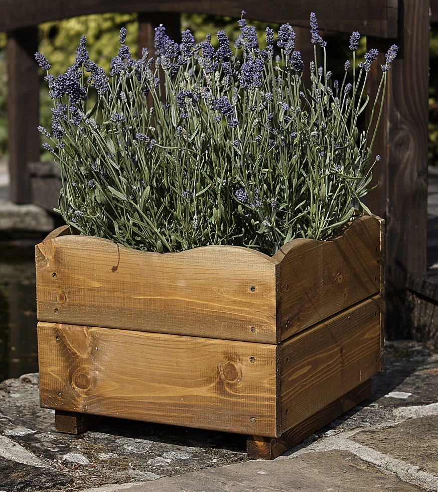 This beautiful designed wooden planter is designed and handcrafted by Tom Chambers from timber and finished with a warm traditional wood stain for weather protection. Features slatted wooden sides to give a cottage garden appearance. Will look stunning planted with a specimen plant or with a variety of bedding plants.