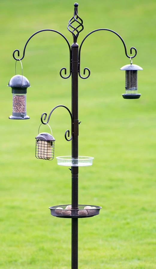 This Royale wild bird feeding station is from the Prestige Collection from Tom Chambers. This Royale feeding station stands 234cm high and is a stunning heavy duty bird station. Feature screw together feeding poles to make a very solid rigid bird station. This feeding stations includes – Heavy duty gauge feeding poles, double bracket with extra large finial top, single bracket, extra large 31cm seed tray, extra large 22cm diameter water and bathing dish and heavy duty ground spikes. Please note the 5 feeders in the picture are not included in the sale