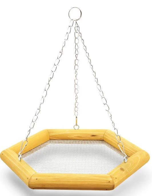 Tom Chambers Snackery Hanging Tray. Hanging seed feeder with a fine steel mesh base, wooden hexagonal frame with galvanised hanging chains with hook. Ideal for hanging on wall brackets and tree branches.