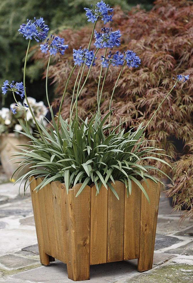 This beautiful designed wooden planter is designed and handcrafted by Tom Chambers from timber and finished with a warm traditional wood stain for weather protection. Features shaped rims. Will look stunning planted with a specimen plant or with a variety of garden bedding plants.